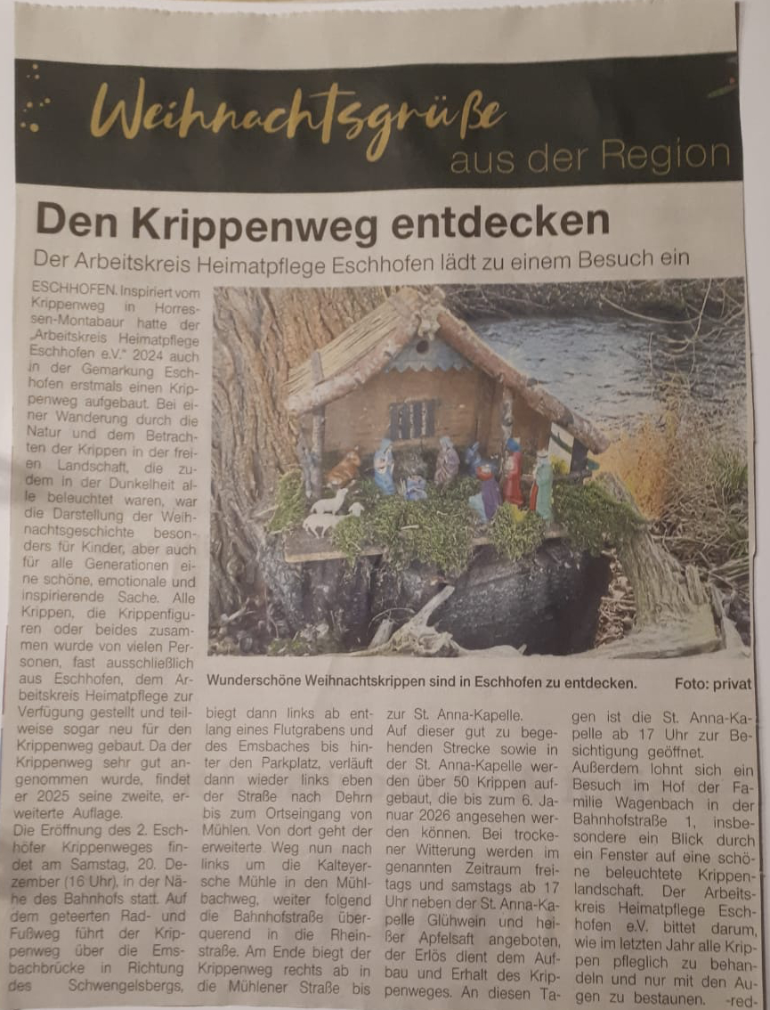 Grundsätzlich inspiriert vom Krippenweg in Horressen-Montabaur und bestärkt durch den Erfolg der ersten Ausgabe im Jahre 2024 hat der „Arbeitskreis Heimatpflege Eschhofen e.V.“ auch 2025 in der Gemarkung Eschhofen wieder einen Krippenweg aufgebaut. Bei einer Wanderung durch die Natur und dem Betrachten der Krippen in der freien Landschaft, die zudem ab dem späten Nachmittag mit der beginnenden Dunkelheit alle noch beleuchtet waren, war die Darstellung der Weihnachtsgeschichte besonders für Kinder, aber auch für alle Generationen eine schöne, emotionale und inspirierende Sache. Alle Krippen, die Krippenfiguren oder beides zusammen wurden von vielen Personen, fast ausschließlich aus Eschhofen, dem Arbeitskreis Heimatpflege zur Verfügung gestellt und teilweise sogar neu für den Krippenweg gebaut.